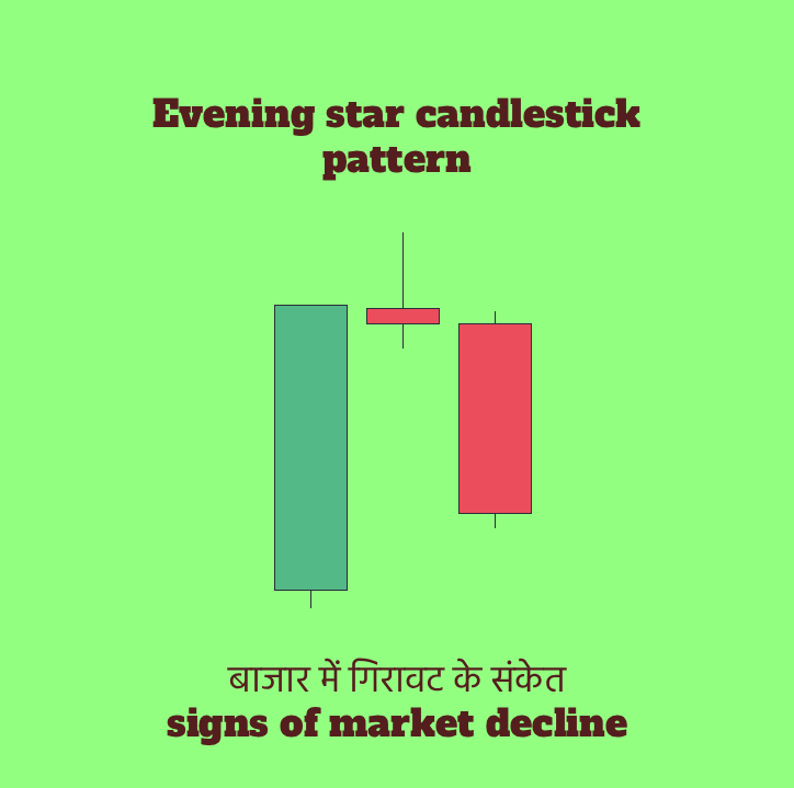 • इवनिंग स्टार कैंडलस्टिक पैटर्न यह तीन कैंडलस्टिक पैटर्न का निर्माण है। यह हमें आने वाली गिरावट के बारे में सटीक जानकारी देता है. ( Evening Star Candlestick Pattern This is a creation of three candlestick patterns. This gives us accurate information about the upcoming decline. )