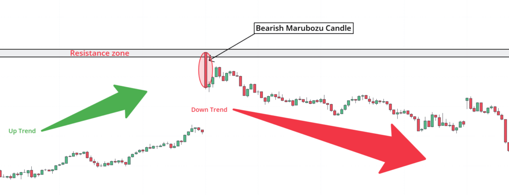 बेरिश मारुबोज़ू कैंडल यह ज्यादातर करके रजिस्टेंस पर अच्छी तरीके से काम करता है. ( Bearish Marubozu Candle It works well at resistance mostly. )
