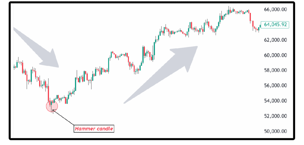• हैमर कैंडल एक मजबूत सपोर्ट पर फॉर्म होता है (Hammer candle forms on a strong support)